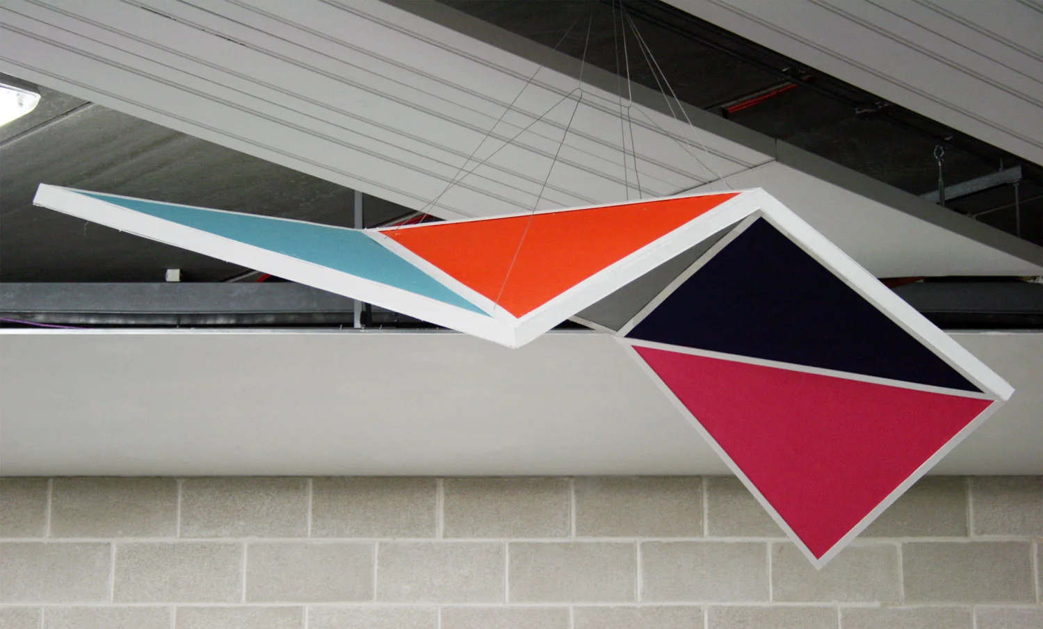 Modular Surface is composed of pieces of the roof of previous work Future Prospectus - Pavilion inverted to distort the shape. The colored felts covering the triangular panels were all that were available at the fabric store at the time, keeping the artist from participating in the color coordination of the piece. Modular Surface was shown suspended from the ceiling in the Triangle Space Gallery in London in 2012.